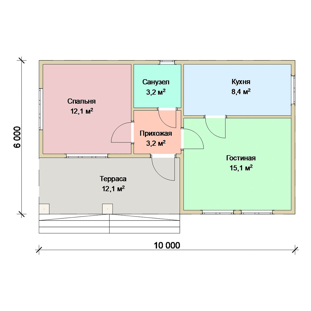 Площадь одноэтажного дома "Гелиос" составляет 60 м2, жилое пространство рационально разделено на функциональные зоны: кухня и гостиная, которые, при желании, можно объединить в одну зону, вместительная спальня, холл, и санузел. Большая терраса дома используется как обеденная зона в летнее время, как место отдыха и приёма гостей.