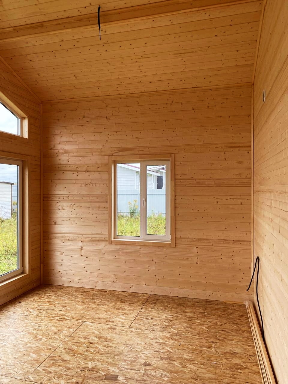 Внешняя отделка дома - виниловый сайдинг, внутренняя облицовка - вагонка "Штиль" сорта АБ камерной сушки, на полу сделана подготовка из ОСП плиты 22 мм для укладки напольного покрытия, на которые уже укладывают ламинат или линолеум. Внутренние двери Эко-шпон (производство Россия). Входная дверь железная с терморазрывом (производство Россия). Ничего подгонять при ремонте не потребуется, так как при строительстве каркасных домов обеспечивается идеальная геометрия поверхностей и стыковка углов.