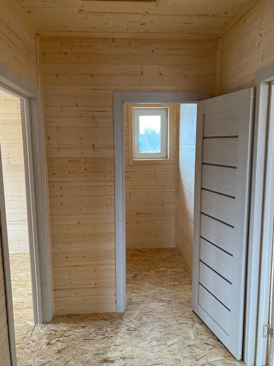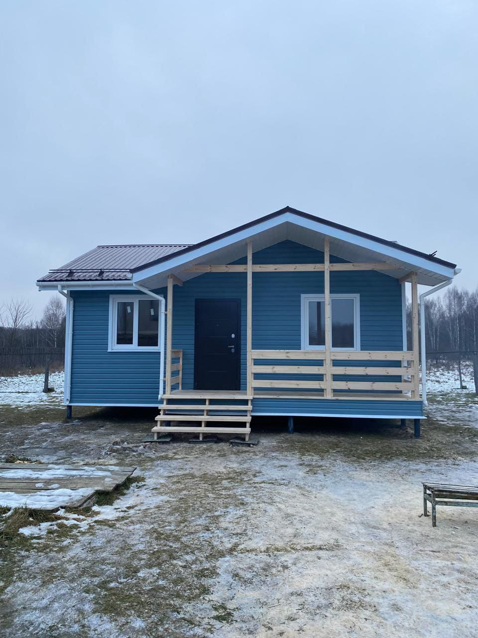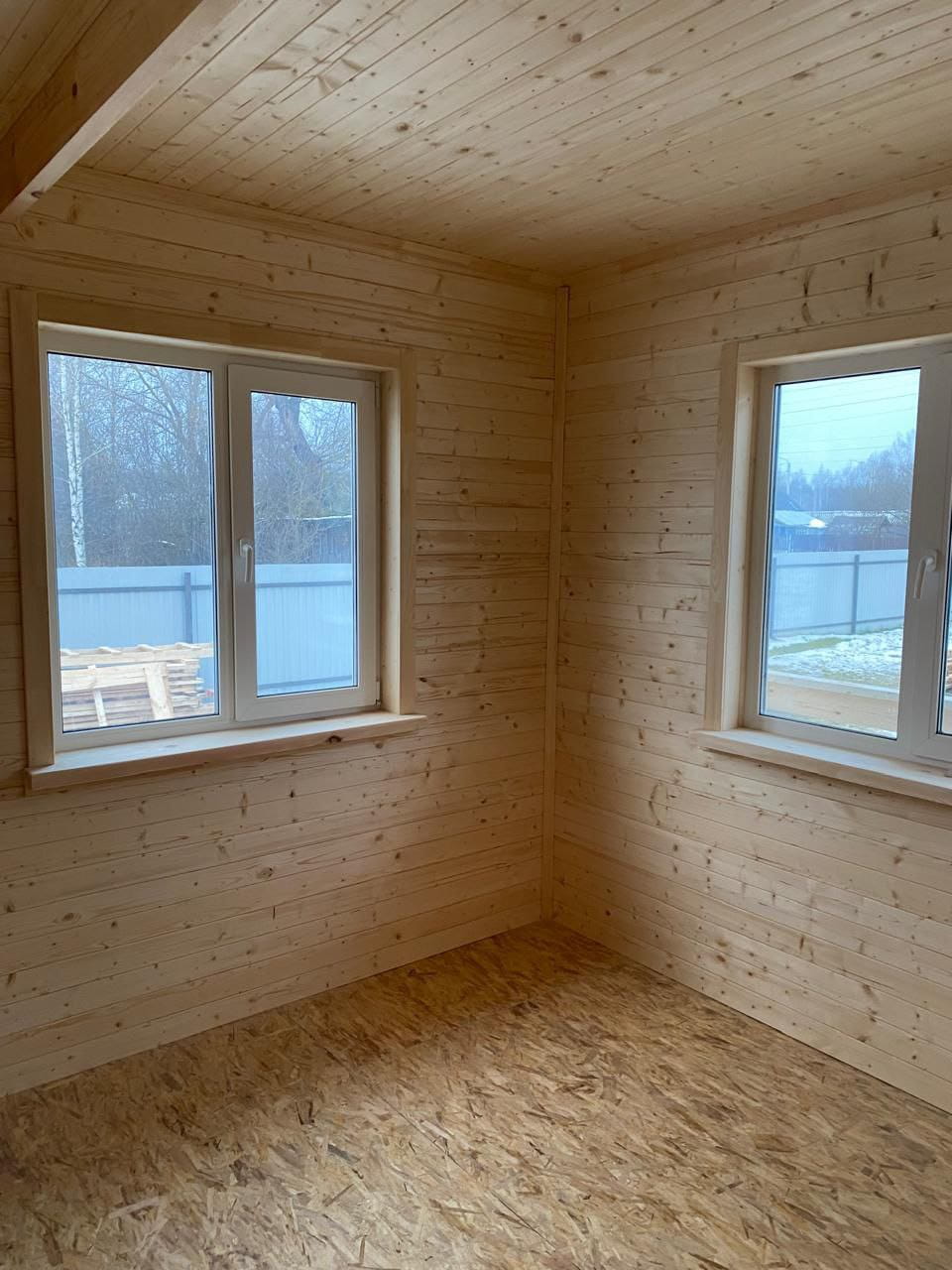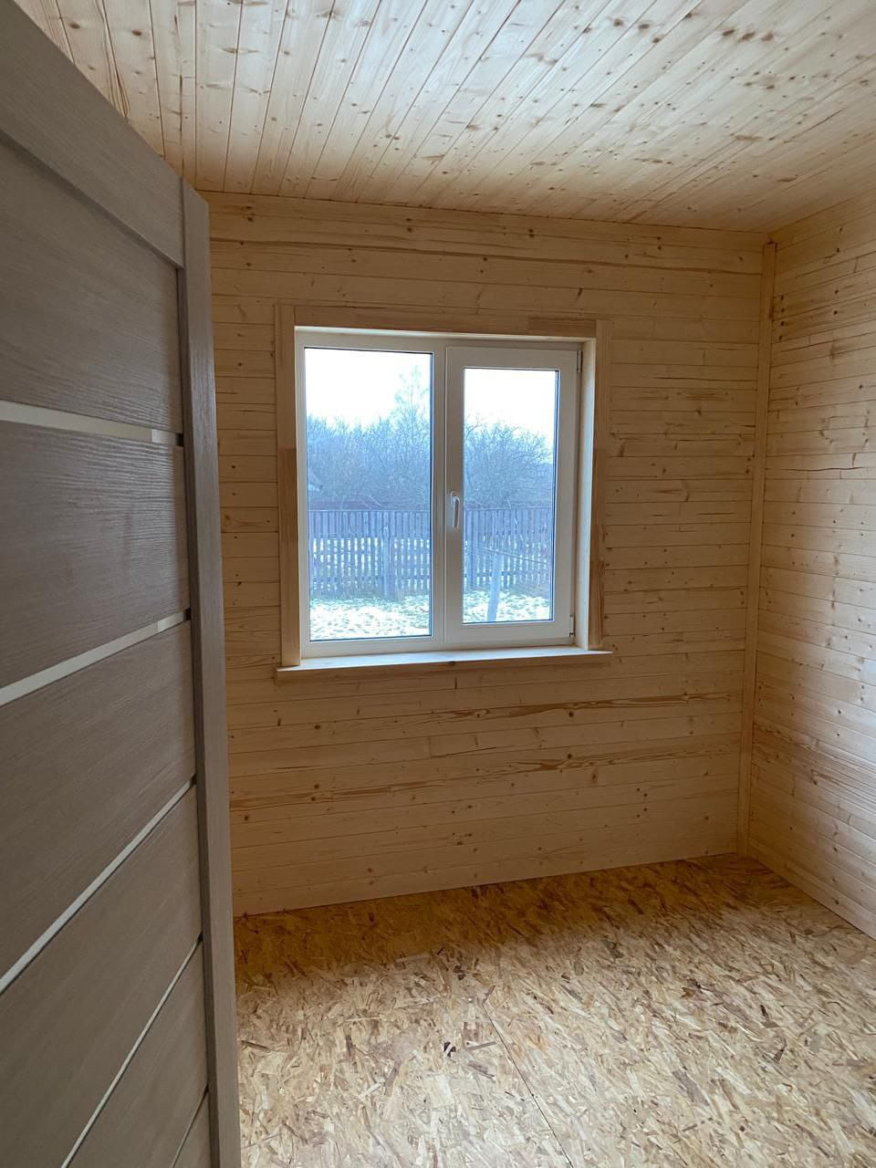 Дом выглядит аккуратно и современно в загородном ландшафте, его размеры 6х8 м. Все элементы архитектуры расположены симметрично, окна ПВХ большие (с поворотно-откидным механизмом, стеклопакет однокамерный), входная металлическая дверь утепленная (производства Россия) защищена широким навесом. Рядом с входом находится открытая терраса, которую, при желании, можно застеклить. Для внешней отделки фасадов мы использовали сайдинг "Альта Профиль КЛАССИКА", для внутренней облицовки стен - стандартную вагону камерной сушки "Штиль" сорт АБ (без покраски 12 мм). Напольное покрытие - плиты ОСП 22 мм. Межкомнатные двери стандартные - Экошпон (Россия). Кровля дома стандартная - цветной профилированный лист С20.